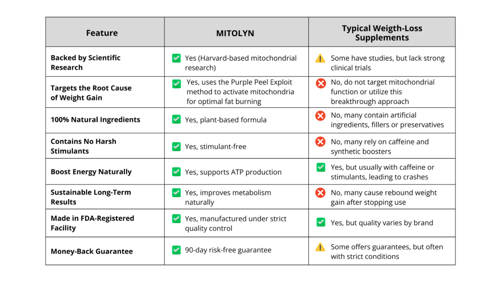 While some weight-loss products may offer natural ingredients or short-term energy boosts, Mitolyn is designed for sustainable, long-lasting results without the side effects.
